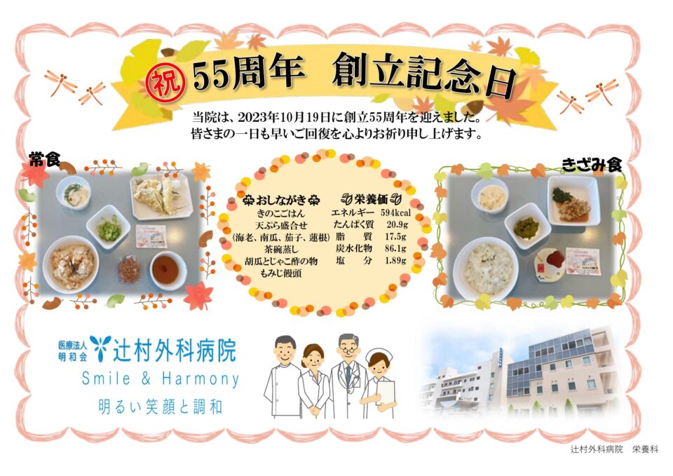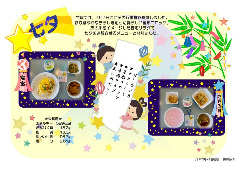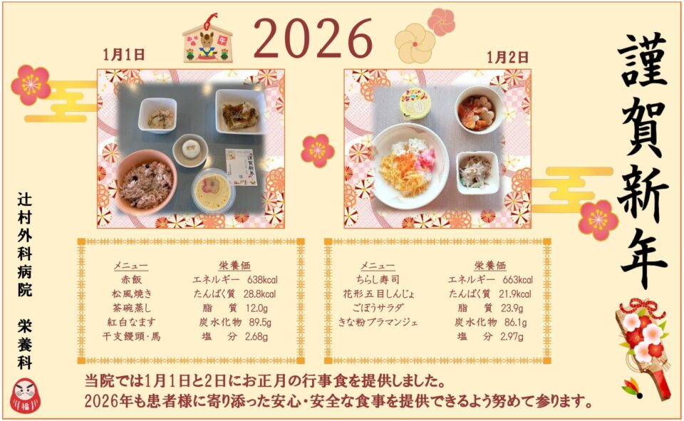 入院中も季節を感じられるよう、毎月行事食を提供しています。適時適温で患者様へ安心・安全な食事を提供します。
