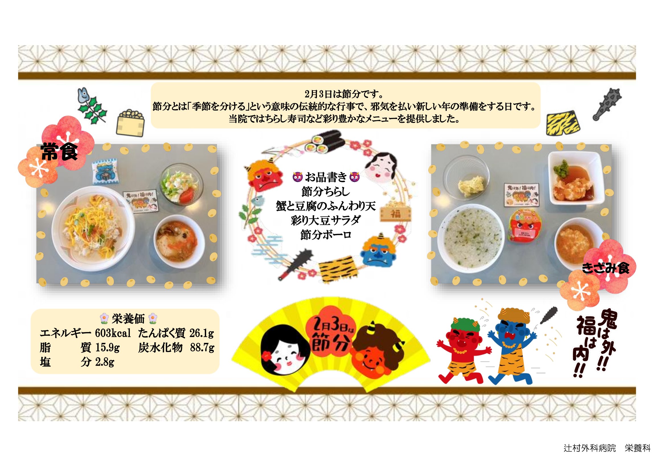 当院では患者様に喜んで頂けるよう、季節や様々な行事に合わせて工夫を凝らした食事を提供しています。 先日は節分メニューを提供させていただきました。 ぜひご覧ください。