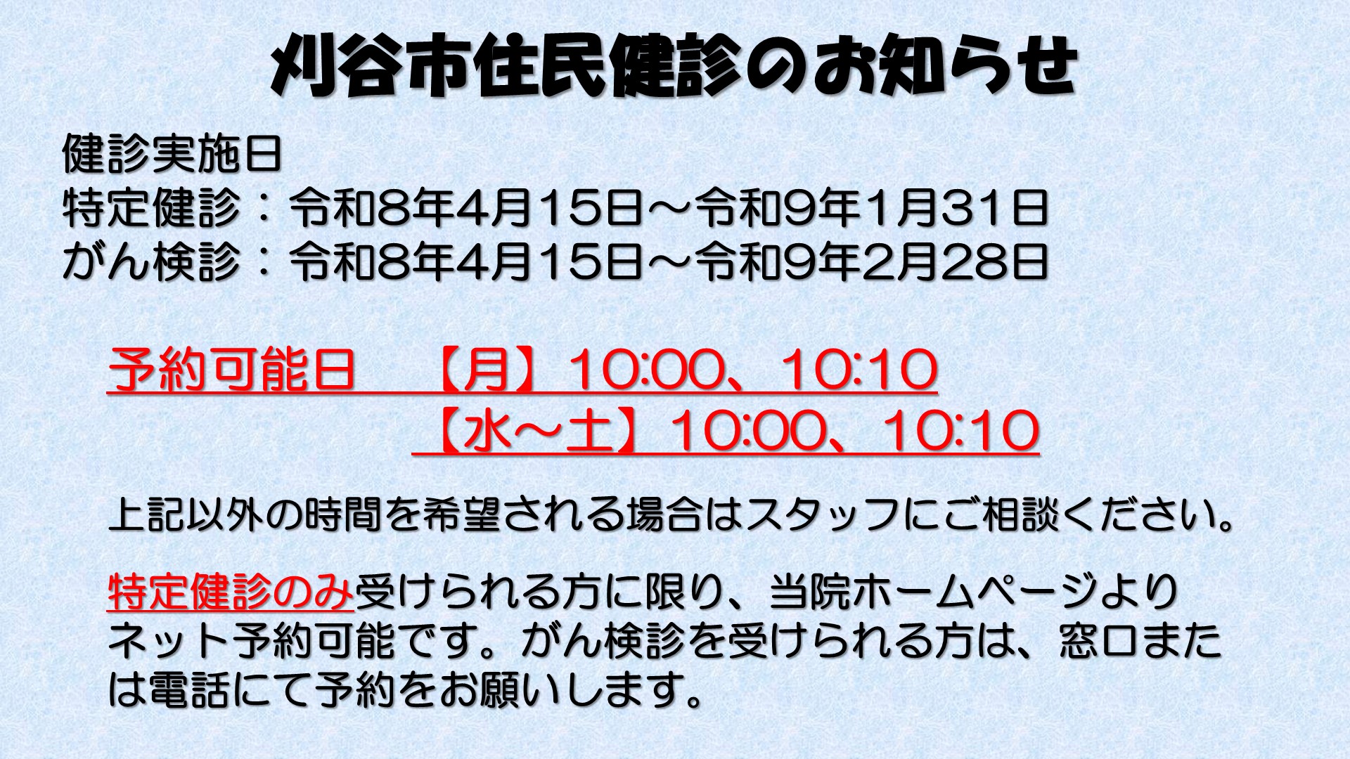 刈谷市住民健診の受付を開始いたしました。